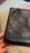 Sleek black leather clutch featuring a bold logo. Accented with a gold chain strap.