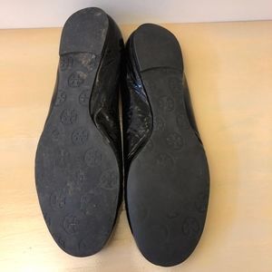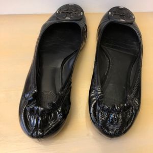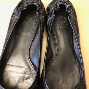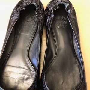 Tory Burch Black Leather Flats 6mTory Burch Reva flats Black metallic leather with leather Tory logo medallion Rubber soles Elasticized around the heels Good condition; light, normal wear on the soles