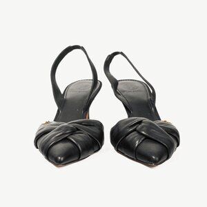 These heels from Tory Burch are crafted in a soft black leather, and feature covered stiletto mid-heels, closed pointed toes, knotted detailing, gold-tone logos, elasticized slingback straps, and leather lining and soles.
