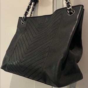 Elegant black leather bag. Features chain straps and tassel accent. Chevron stitching adds style.