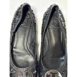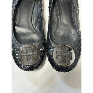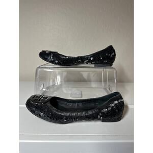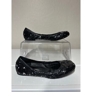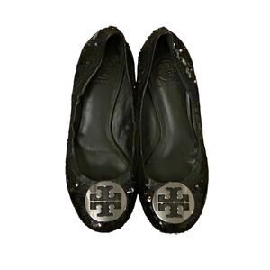 Tory Burch Black Leather Sparkle Sequin Logo Ballet Flats Size 6.5
