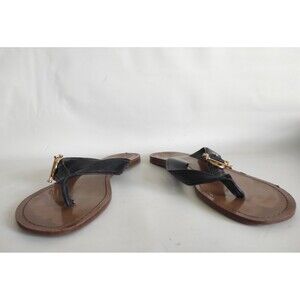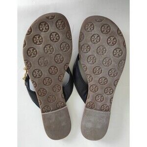 The Tory Burch Black Leather Thong Sandals with a Viridian Horseshoe Bit Buckle are stylish and versatile sandals perfect for any occasion. Featuring a flat heel and slip-on closure, these sandals are made of 100% leather with accents like a strap, buckle, and logo detailing. The black color and solid pattern make them easy to pair with any outfit, while the medium width and comfortable insole material ensure a great fit for women size 9.5. Whether you're heading to the beach, a festival, or a city outing, these designer sandals are a fashionable and classic choice.