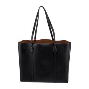 Authentic Tory Burch leather tote in classic black with subtle colorblock detailing and gold-tone hardware. Features dual shoulder straps, leather lining, a spacious open-top design, and a single interior pocket. Elegant yet functional — ideal for work, travel, or everyday use.
