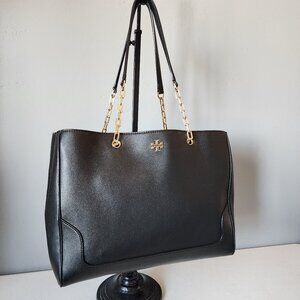 Chic Tory Burch tote. Smooth black leather. Stylish gold chain straps. Ideal for versatile use.