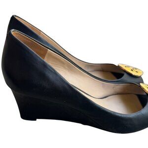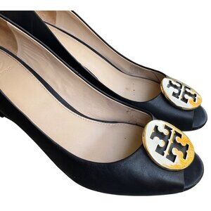 Tory Burch Black Leather Wedge Peep Toe Pumps With Gold Logo Size 10M