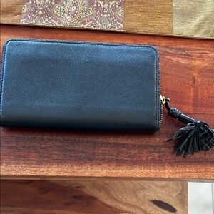 Sleek black leather wallet with tassel accent. Features iconic Tory Burch emblem.