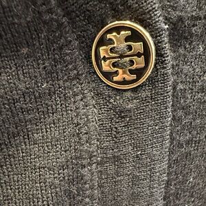 Chic black cardigan by Tory Burch. Features a classic button-up design. Ideal for layering. Pre-loved