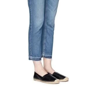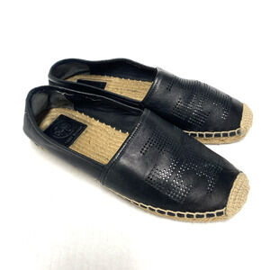 Tory Burch Black Nappa Leather Espadrilles Perforated Logo Round Toe Sli…