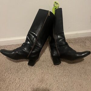Chic black boots with a gold emblem. Perfect for stylish outings. Sorry box or dust bag not included. Accepting reasonable offers. Thank you for looking 🙂