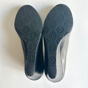 Tory Burch Black Pebble Genuine Leather Heel Wedges size 7.5. Heel 2.5”, silver metal logo, open toe. In great condition, gently worn a few times, a few small scuffing on the leather and metal (see pictures).