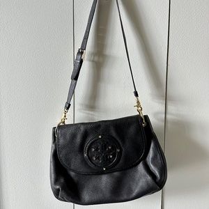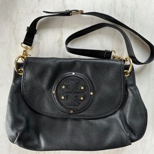 Black Pebble Leather Tory Burch crossbody bag with gold hardware + accents; Authentic, pre-owned in excellent condition