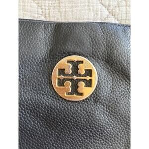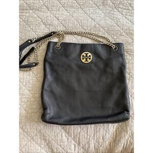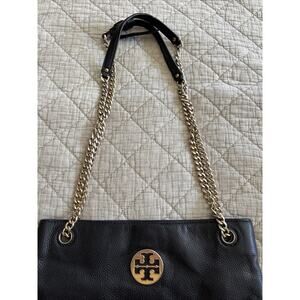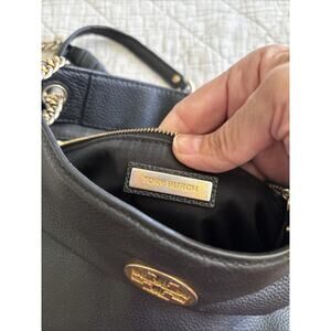 Tory Burch Black Pebble Leather Swing Shoulder/Crossbody Bag. Looks great but the plated medallion and strap has weathered a bit some of the gold tone is off or tarnished. I think can be fixed but I didn’t try