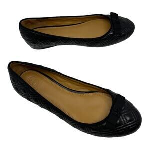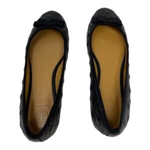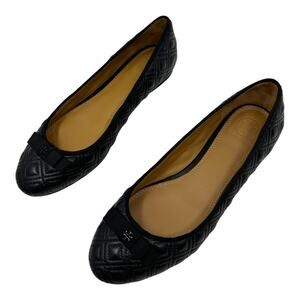 Tory Burch Black Quilted Leather Ballet Flats Bow Logo Size 7M