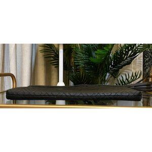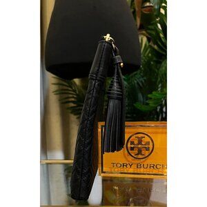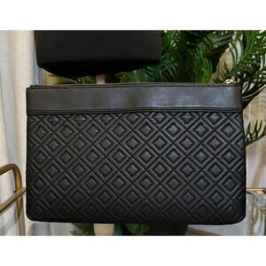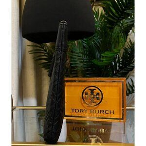 Elevate your evening look with this sleek Tory Burch Black Fleming Clutch. Its luxurious quilted leather exterior and versatile design make it an elegant accessory choice.