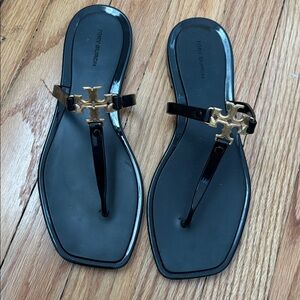 Chic black sandals featuring a gold emblem. Ideal for versatile styling.