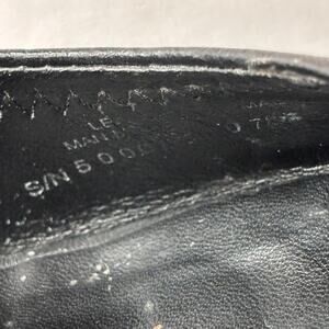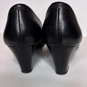 Black pebbled leather with silver metal logo on toe vamp. Stacked wooden wedge heel. Rubber sole. Size 8.5M. Good used condition. Some leather is peeled off the toe area. Wear shows on the sole. Leather on sides and top along with the metal logo are in great condition. Ships without original box and no dust bag.