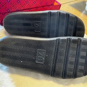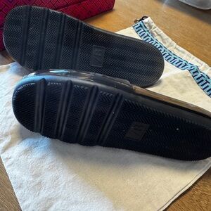 Worn only once. perfect condition. size 7. in box with shoe bag. Sleek black jelly slide sandal.