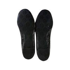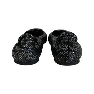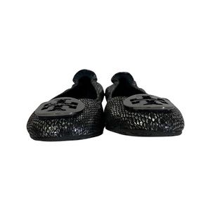 Elegant black flats with embossed snakeskin print detail. Features signature Tory Burch logo. Perfect for any occasion.