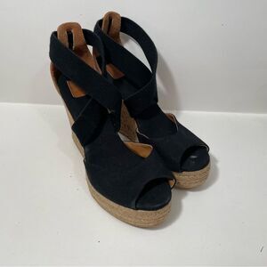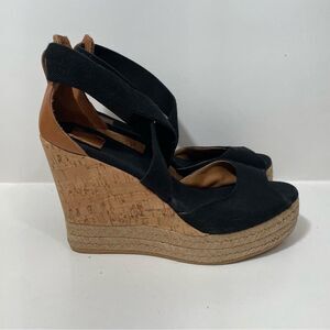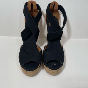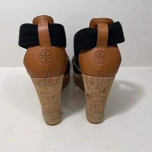 Gently worn women's size 8 Tory Burch Black Strappy Wedge Sandals. Stretchy Straps, cork and espadrille bottom. Please review all photos for any signs of wear-pictured as is. Disclaimer: Any items with any wear/staining has not been treated, and unsure of ability to remove/treat condition. Comes from a smoke free home, bundle with other items to save & minimize shipping cost.
