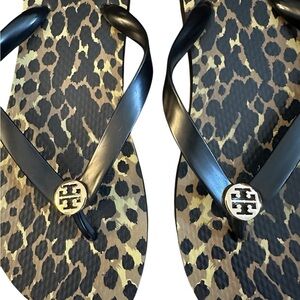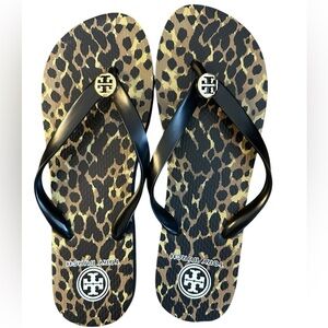 Tory Burch Black Tan Leopard Print Thong Flip Flops Cheetah with Gold-tone Logo