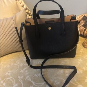 Elegant black leather tote bag with a sleek design. Perfect for any occasion.