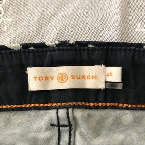 Tory Burch walker cargo pants. Dotted pony black skinny jeans size 25. Cropped length. There are cargo pockets on legs, slanted pockets on front and two back pockets. TB logo is on all buttons on jeans. These jeans are in EUC.