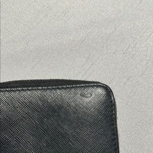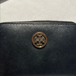 Elegant Tory Burch wallet. Features a gold logo. Compact and stylish. Wear and tear pictured. Gold has partially rubbed off on logo, zipper pull and inner loop. Still in good condition.