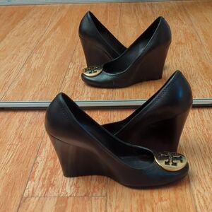 Elevate your style with these elegant Tory Burch wedge heels, size 6 1/2. Featuring a sleek black design complemented by striking gold accents, these shoes are perfect for any occasion. Experience comfort and sophistication with every step. Very lightly used. No box.