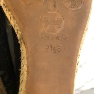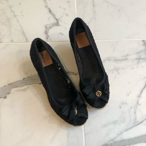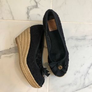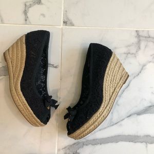 Elegant black lace wedges. Features a bow accent. Comfortable woven heel.