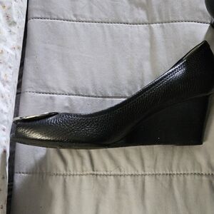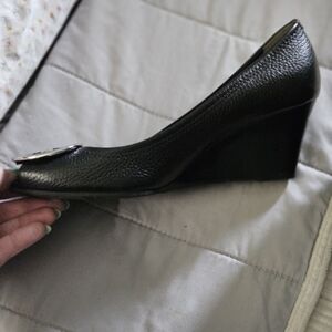 Tory Burch Black Wedges Peep Toe with Silver Logo Size 9.5