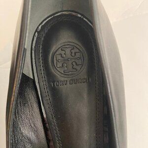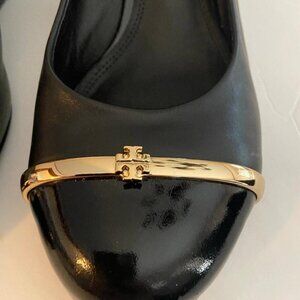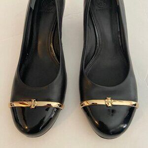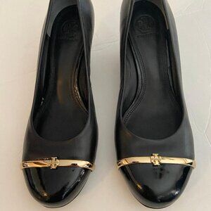 Chic black wedges featuring gold accents. Iconic Tory Burch design. Ideal for versatile styling.