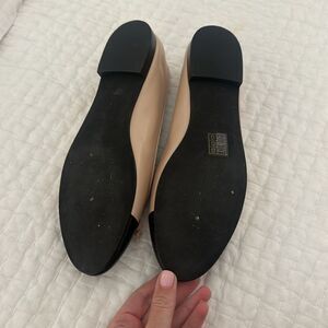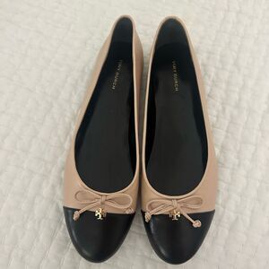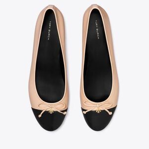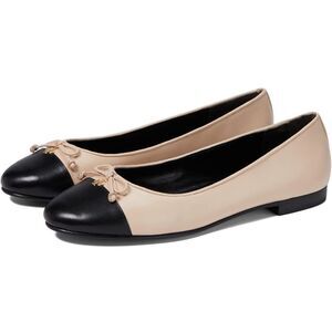 Elegant flats with a black toe and cream body. Features a bow accent with gold logo detail.