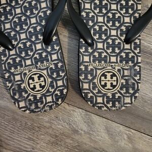 Stylish Tory Burch flip flops in black and cream. Perfect for casual wear.
