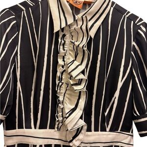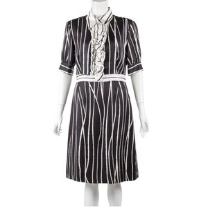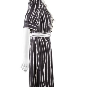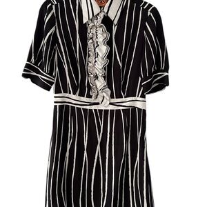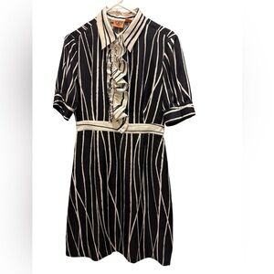 Tory Burch black and cream striped knee length short sleeved shirt dress with ruffles down the press button front. Features side zip fastening.
