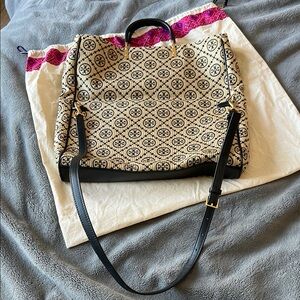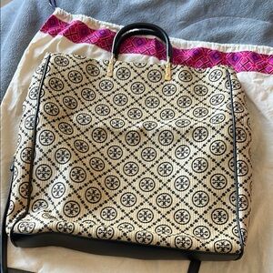 Tory Burch Black and Cream Tote with Geometric Pattern