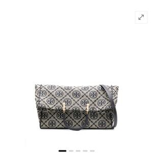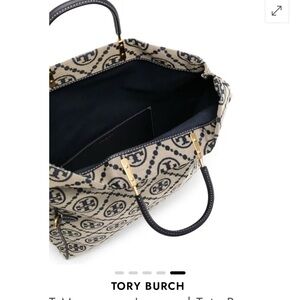 This elegant Tory Burch tote features a sophisticated black and cream geometric pattern, complemented by sturdy black leather straps. Its structured design makes it a versatile choice for both casual and formal occasions.