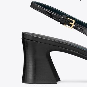 These Tory Burch flats feature a sleek black patent leather finish, highlighted by a striking gold-tone chain across the front. The square toe design and adjustable slingback strap ensure both style and comfort, making them a versatile addition to any wardrobe.