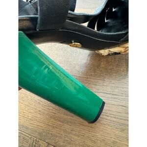Elegant black leather with a striking green block heel. Features a woven tan platform. Perfect for a chic look.
