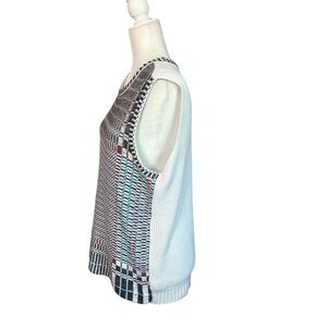This Tory Burch sweater top features a sleek black and white design offering a modern and versatile look. The sleeveless style and muscle tee cut make it perfect for layering or wearing on its own. Crafted with attention to detail, this top is a stylish addition to any wardrobe.