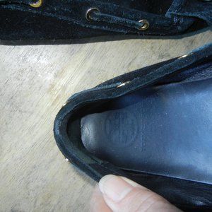 Black Suede with Gold Emblem shoe size 6.5. These were worn but still has lots of wear left. Look at each picture as they are what you are buying. Smoke free home