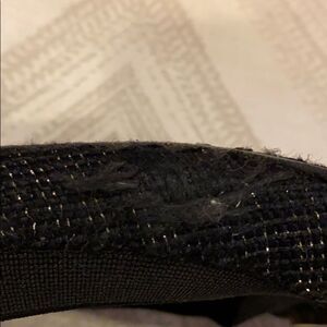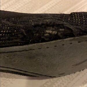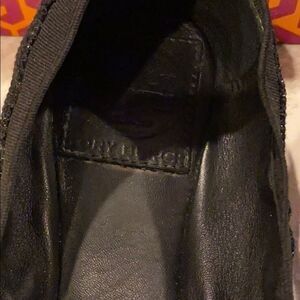 Tory Burch Black Caroline Arabia Elastic Flat Shoes. Fabric Is tweed like. Wear on outside of each shoe. Black & gold emblem. Wear but still great shoe. Size 7.5.