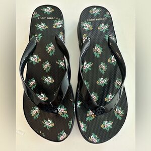 Pretty floral pattern in pink and green on black background with black straps and black Tory Burch medallion.