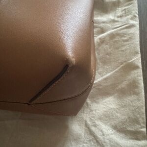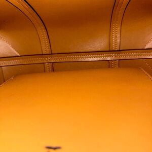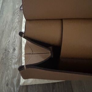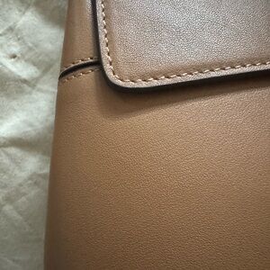 Elegant tan leather bag, perfect for any occasion. Two bottom corners have visible wear, but this bag is in near perfect condition otherwise. Cases work perfectly and straps and piping are in excellent condition. See photos for details. Dustbag included.