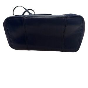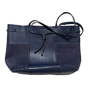 Tory Burch Block T Medium Tote Bag in ‘True Navy.’ Gold tone hardware, dual flat shoulder straps, tonal suede panels, foil-stamped logo accent at front, toggle closure. Bag is well loved. Please see photos for details on signs of wear.