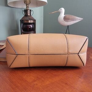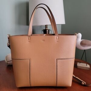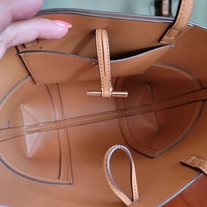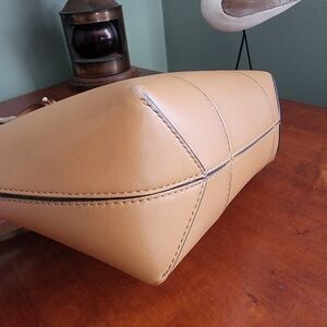 Tory Burch Block-T Small Tote Mustard Yellow Unlined Leather Bag. Exterior is made of unlined mustard yellow leather, with clean lines and matching yellow stitching. This line of bags is the epitome of luxurious minimalism. Gold-tone hardware, with toggle top closure. A true tote, the interior is an open compartment made of matching yellow leather, with one slip pocket.
