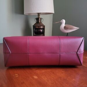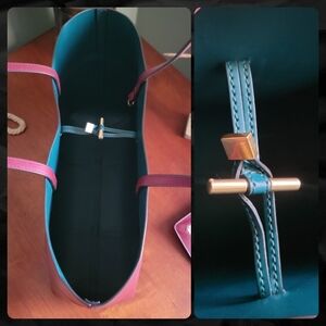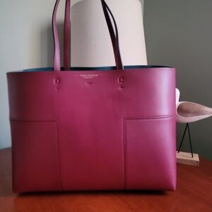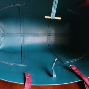 Tory Burch Block-T Tall Tote Cranberry Burgundy Unlined Leather With Zip Pouch. Exterior is made of unlined burgundy leather, with clean lines and matching burgundy stitching. This line of bags is the epitome of luxurious minimalism. Gold-tone hardware, with toggle top closure. A true tote, the interior is an open compartment made of jewel toned deep teal leather.