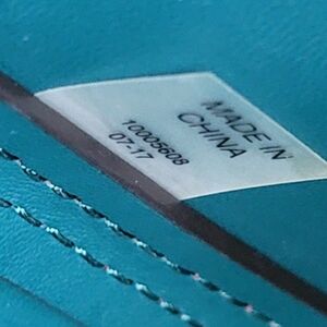 The smaller pouch is completely matching with burgundy exterior and teal interior, a zipper closure and gold-tone Tory Burch logo. It clips to a d-ring inside the bag.