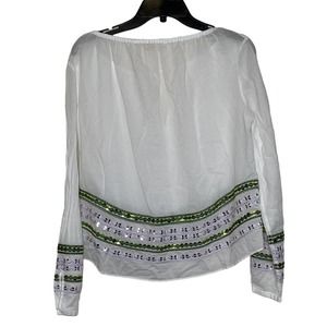 Tory Burch Blouse Size 2 White With Green Pink Sequin 100% Cotton LS Tasseled