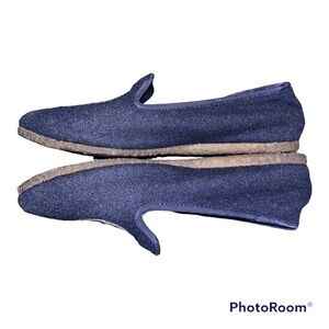 Slippers, shoes, felt, blue, navy blue, faux fur, fur lined, logo, slip on, logo, billy, Tory Burch, cozy, warm, snuggly, fall, winter, house shoes, womens, preppy