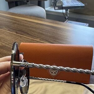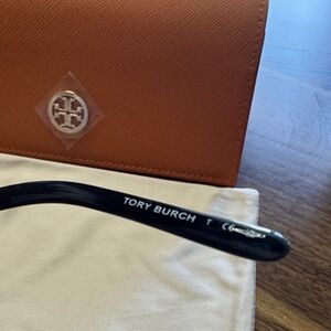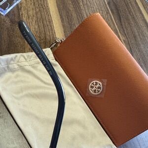 Stylish black sunglasses by Tory Burch. Paired with a vibrant orange wallet. Perfect for a chic look.
